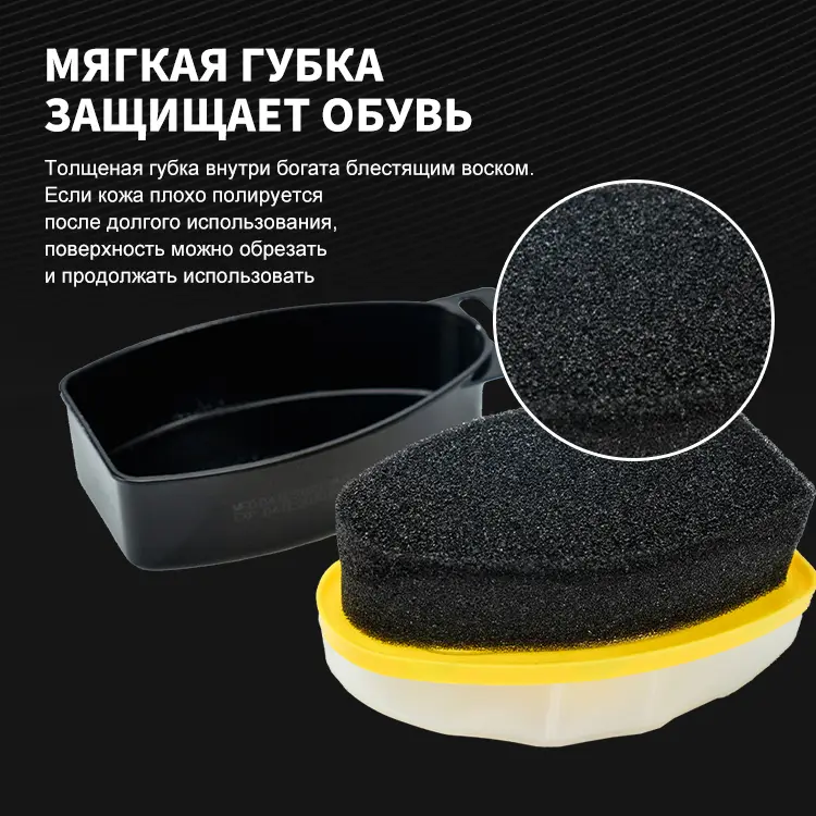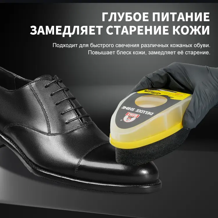 Продукт сочетает в себе встроенную губку и качественный крем, обеспечивая мгновенный блеск, защиту от влаги и сохранение цвета обуви без лишних усилий.