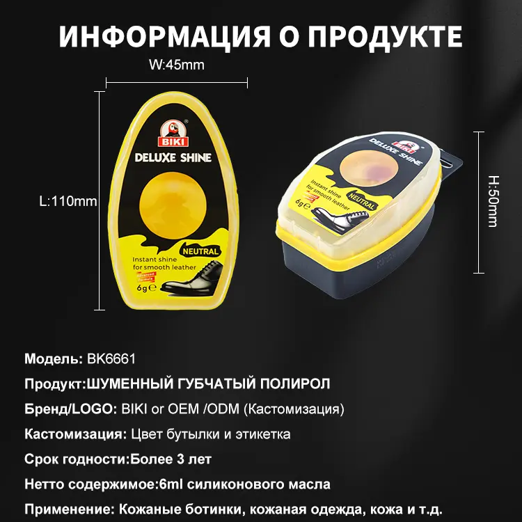 Описание продукта BK6661 Губка с кремом для обуви – это готовое решение для быстрой и удобной полировки обуви, идеально подходящее для брендов по уходу за обувью, оптовых покупателей и дистрибьюторов. Продукт сочетает в себе встроенную губку и качественный крем, обеспечивая мгновенный бл...