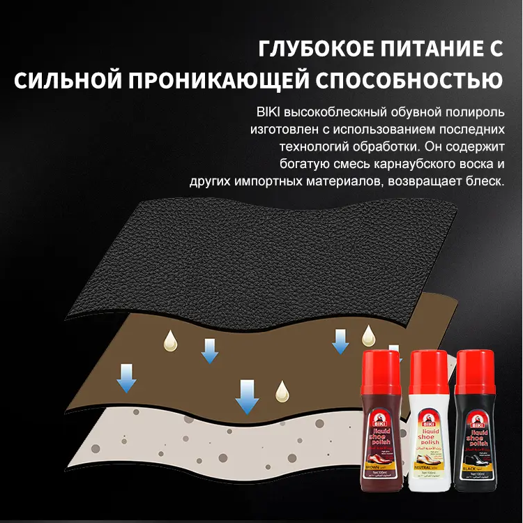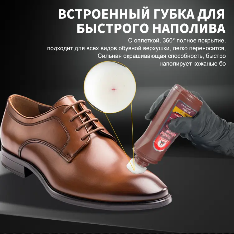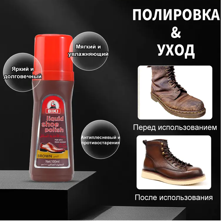✔ Быстрый уход – жидкая формула легко наносится и быстро впитывается, придавая обуви естественный блеск